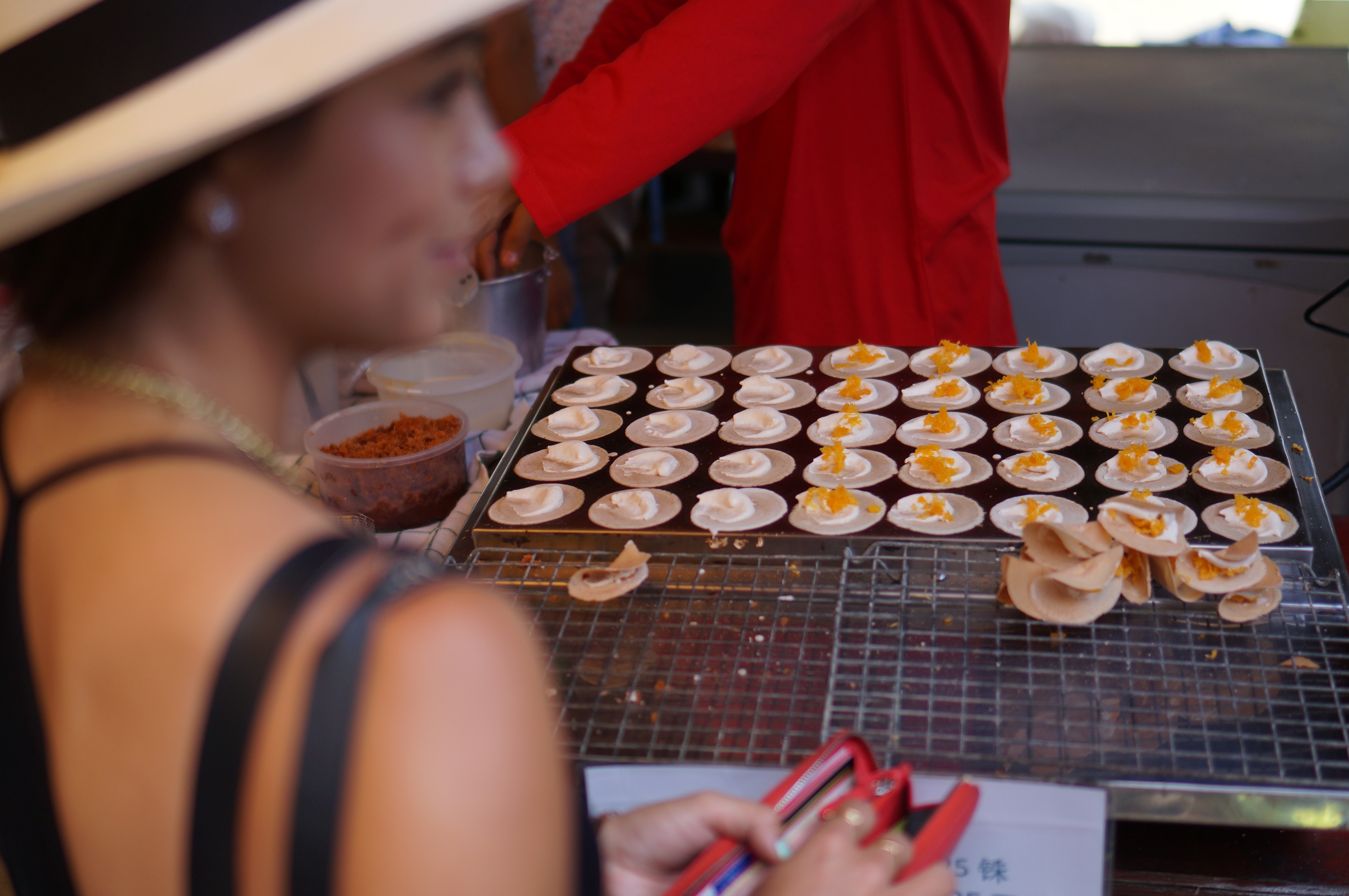 kanom beung If you’ve never had Kanom Bueng I strongly suggest you try it- a little sweet, a little savory, they’re perfect for when you’re in that snackish mood but don’t know what you want. Kanom Bueng are tiny Thai crepes that look like tacos, thin and crispy on the outside with a meringue like smear on the inside before being topped with either toasted coconut, minced shrimp and scallions, or foy thong, a sweetened egg yolk dessert.