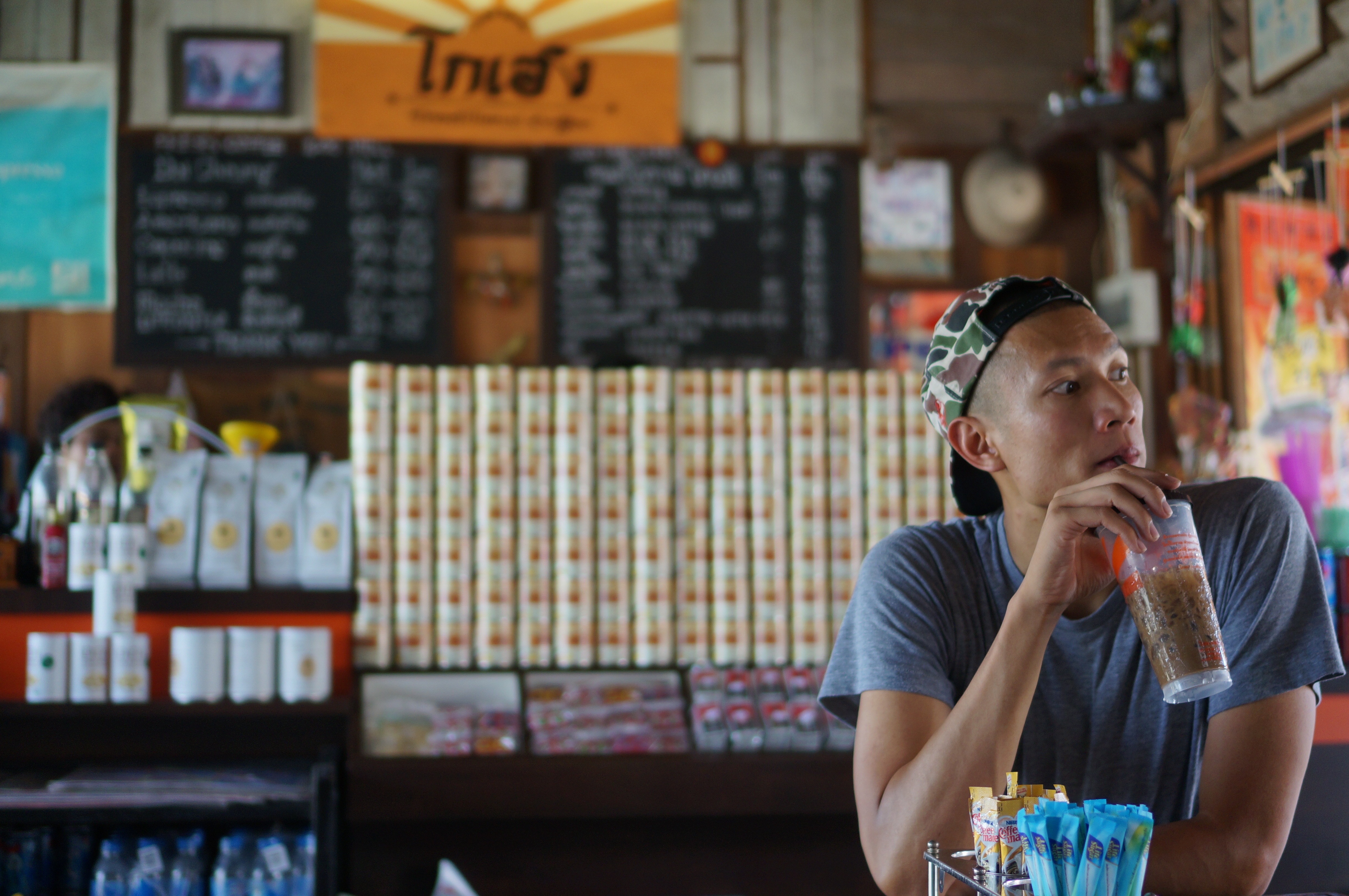 coffee shop To wash down the treat we found an old school coffee shop for some authentic Thai Iced Coffee. The whole shop was made to look retro and even had vintage toys, treats, and packaging.