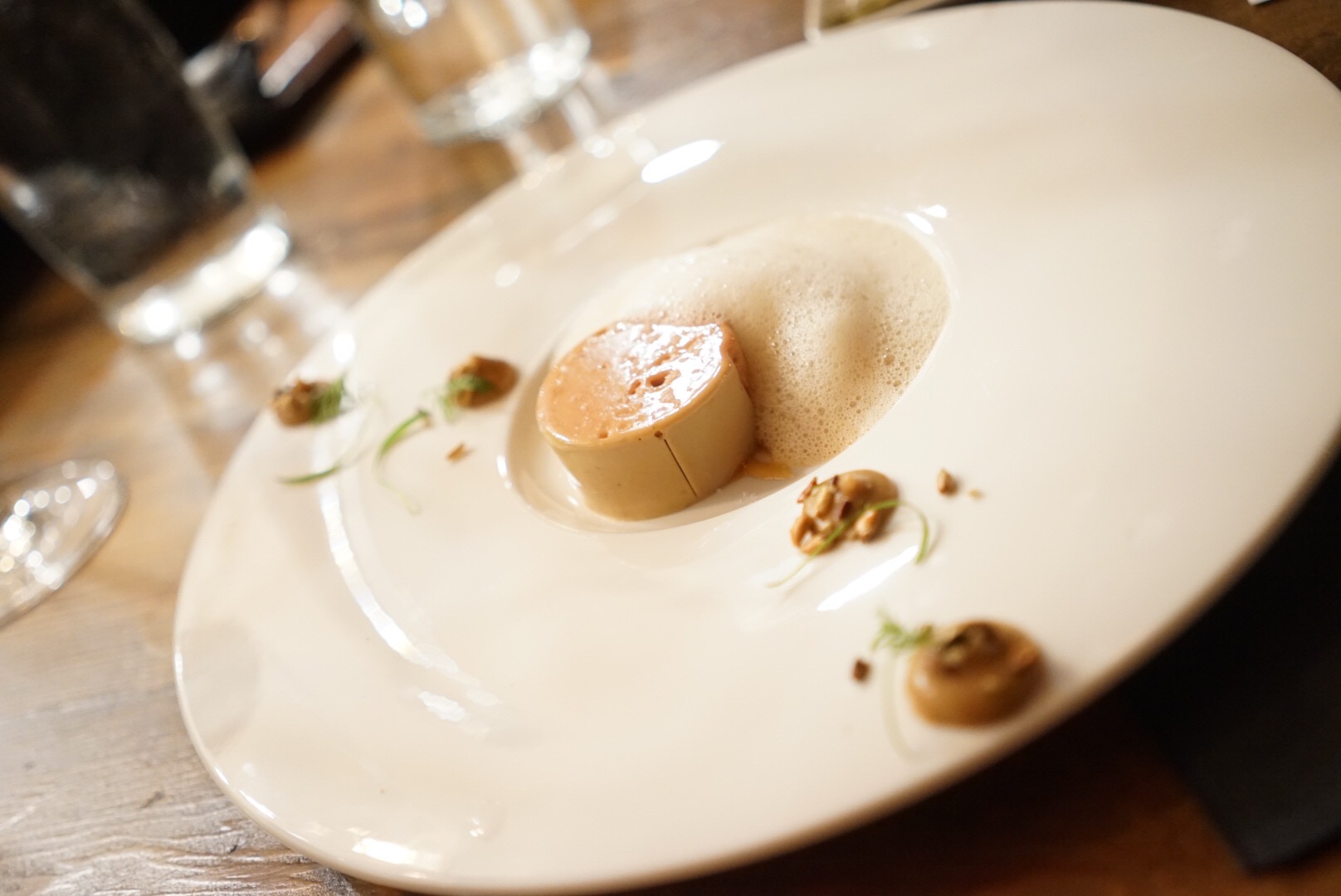 Foie gras pate on preserved lemon gastrique, roasted quince purée with puffed wild rice & furikake, nuzzled in a mushroom miso dashi foam.