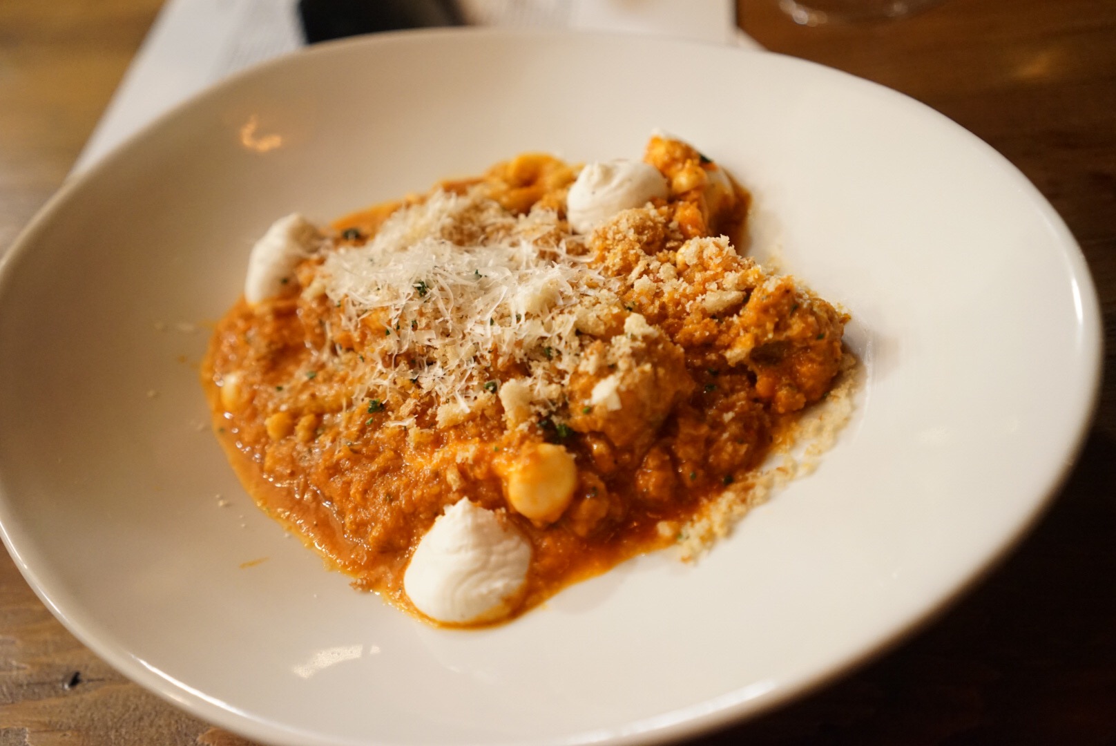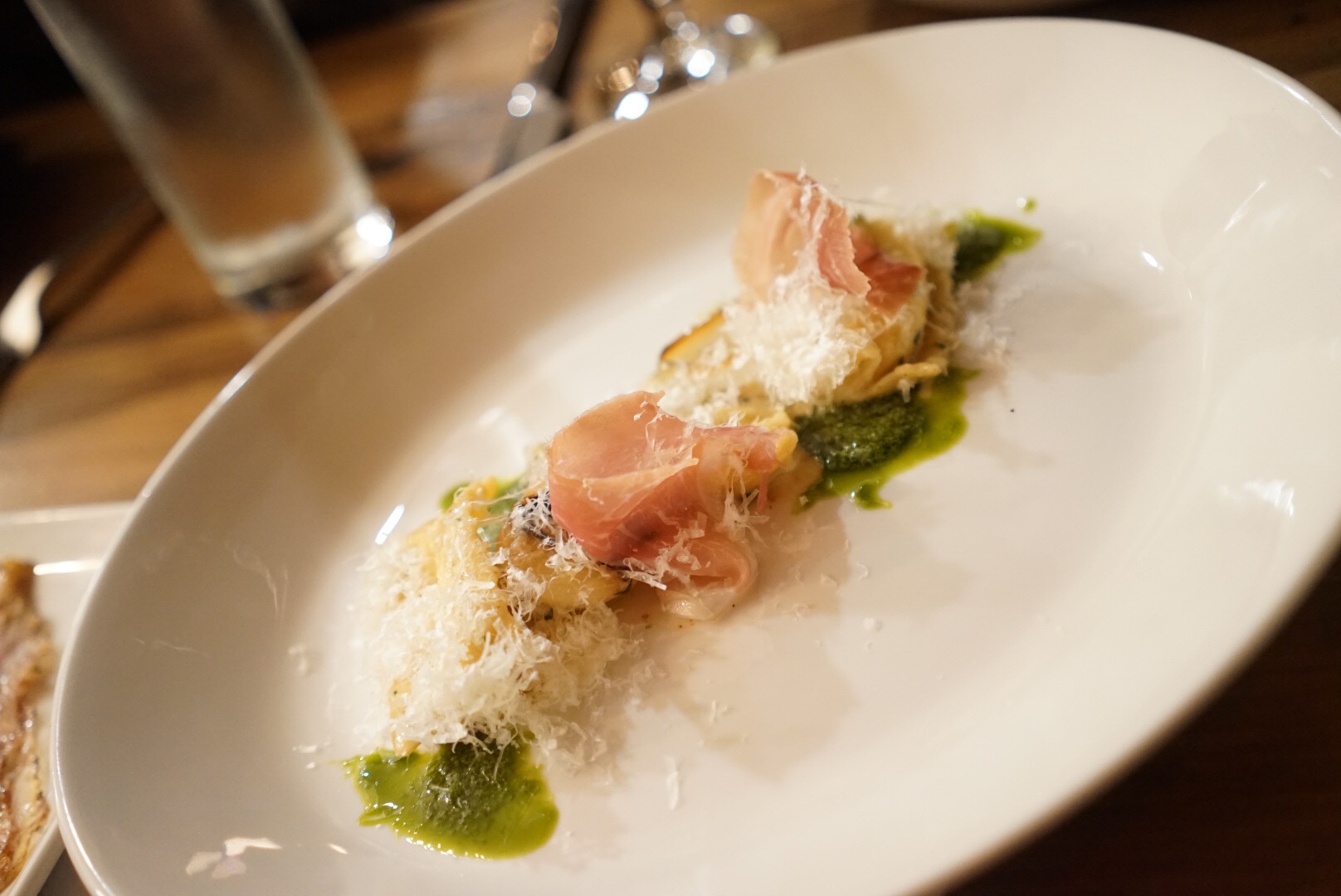 Sweet potato agnolotti in brown butter with prosciutto, basil pistou, & parmesan.