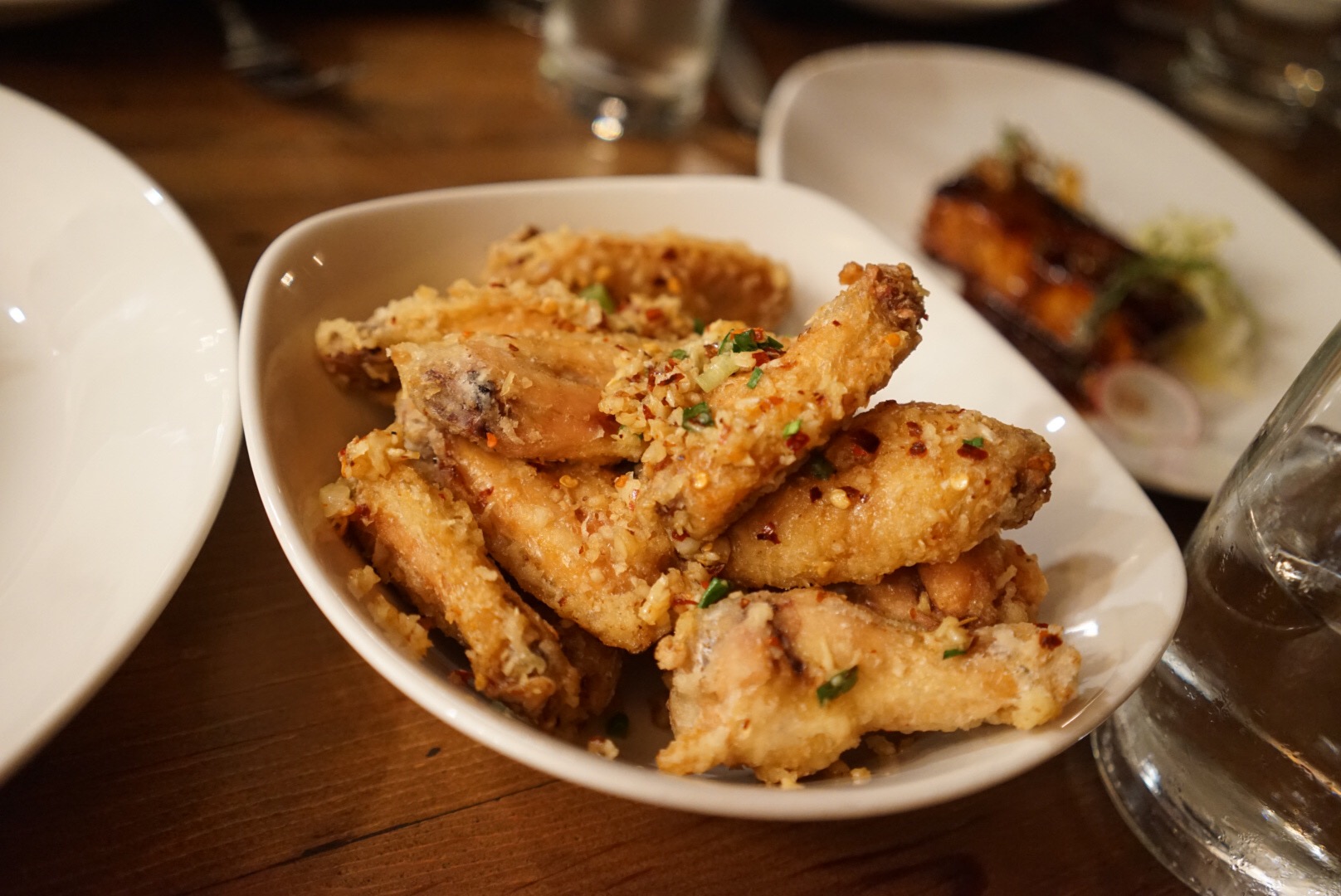 Salt’n’pepper chicken wings with garlic, red chilies, & chopped scallions.