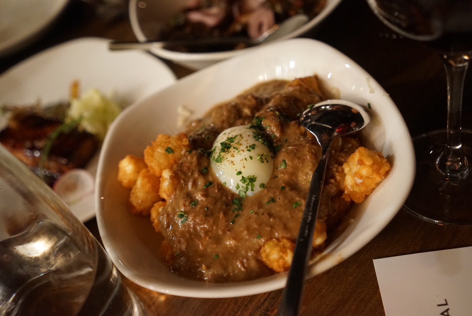Tater tot poutine with short rib gravy, cheese curds, chives, & a 145• sous vide egg.