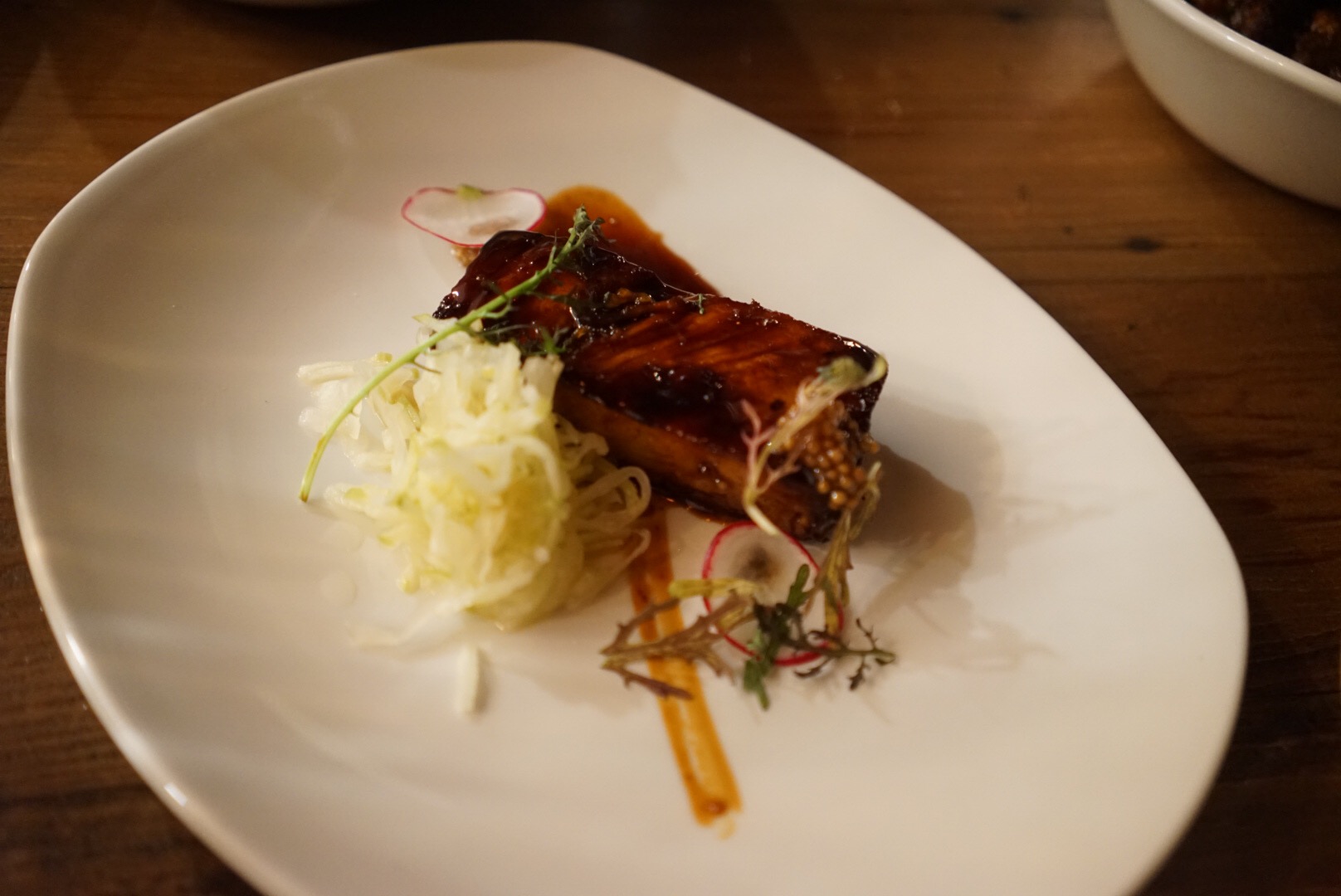 Braised pork belly with apple sauerkraut, shaved radish, & pickled mustard seeds.