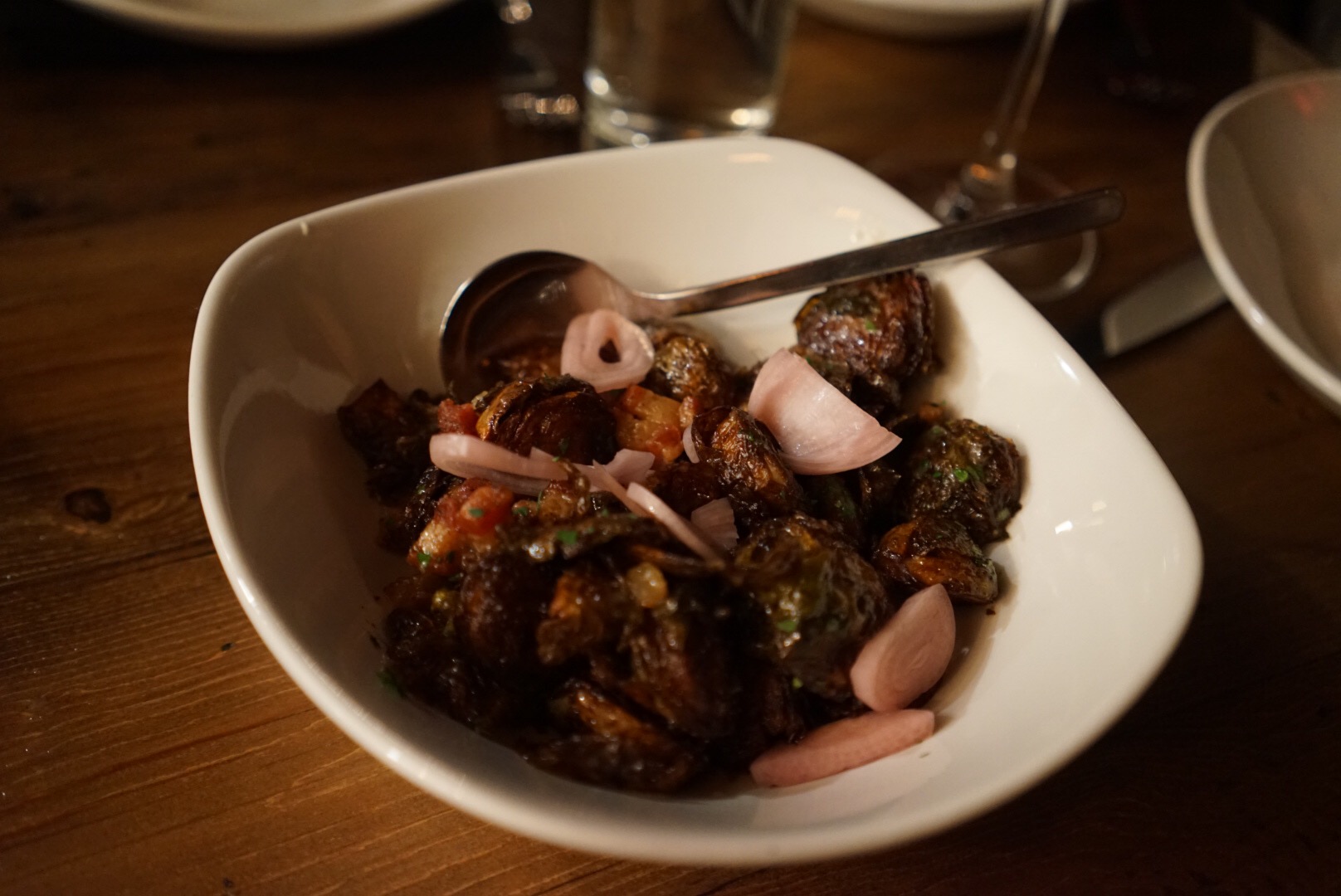 Fried brussel sprouts with pancetta & pickled shallots in a apple cider vinaigrette.