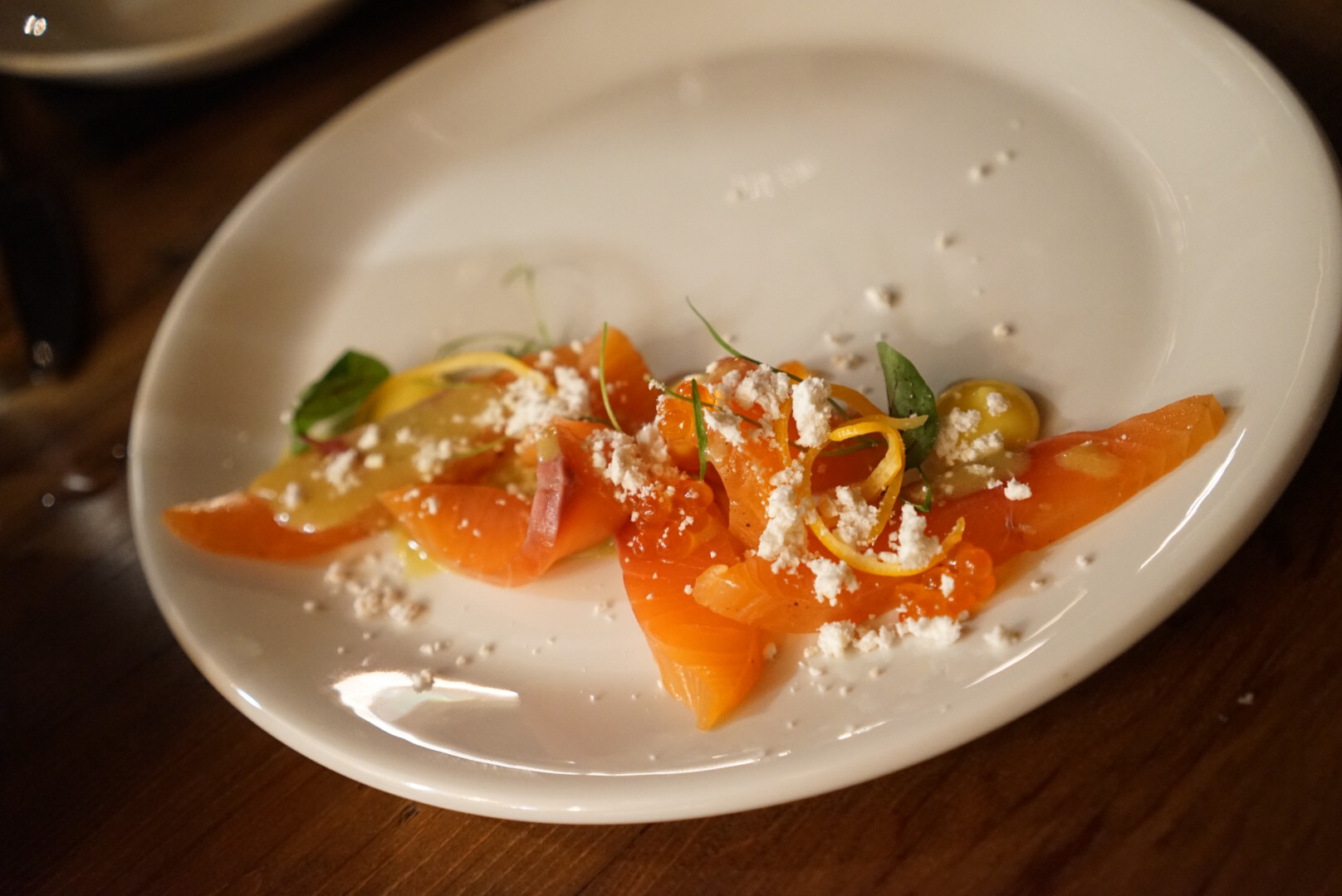 Citrus cured salmon in a citrus purée with preserved lemons, pinenut powder, & ikura.