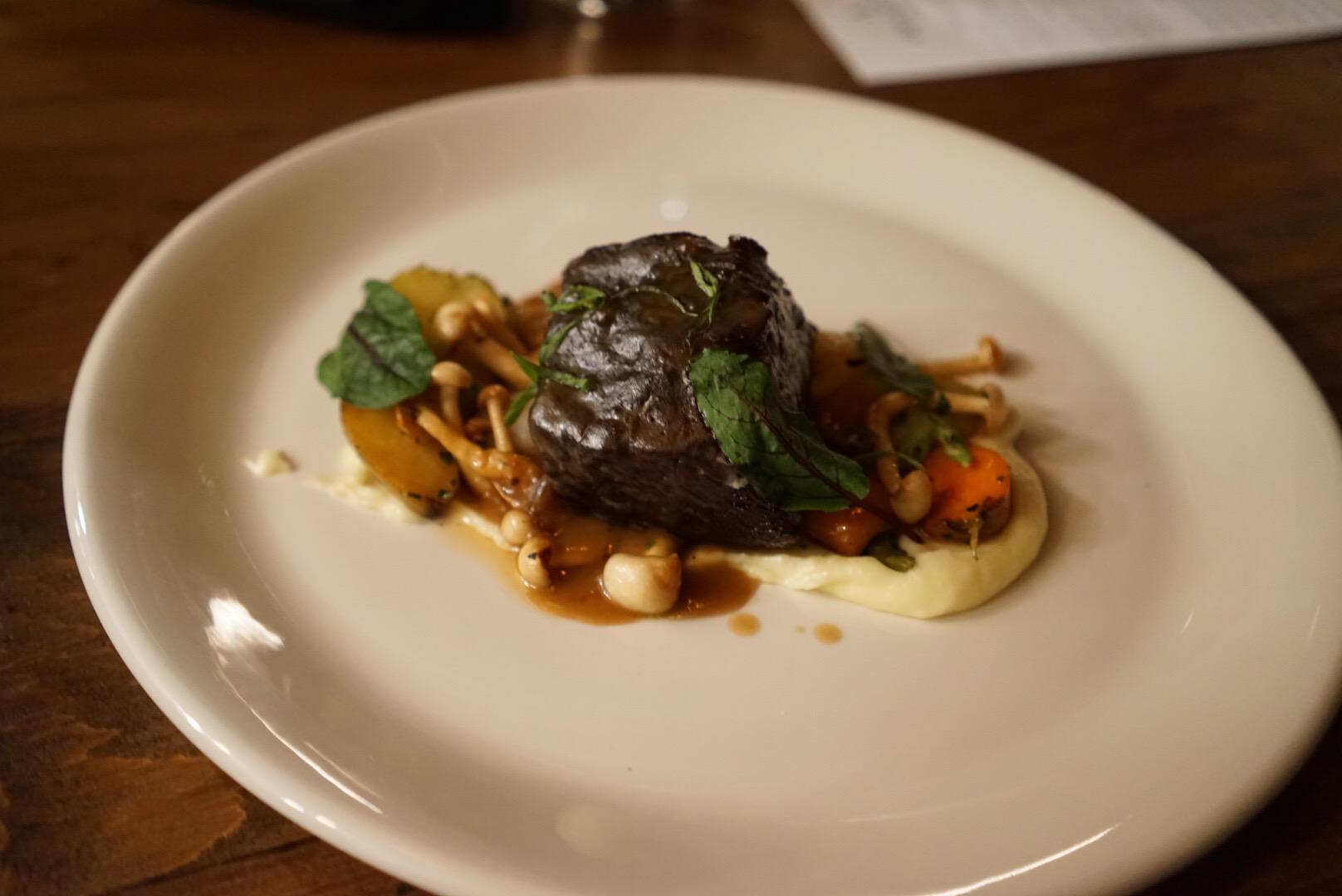 The Abnormal short rib in a No. 35 blend red wine sauce with pearl onions, mushrooms, & root vegetables over a potato purée.