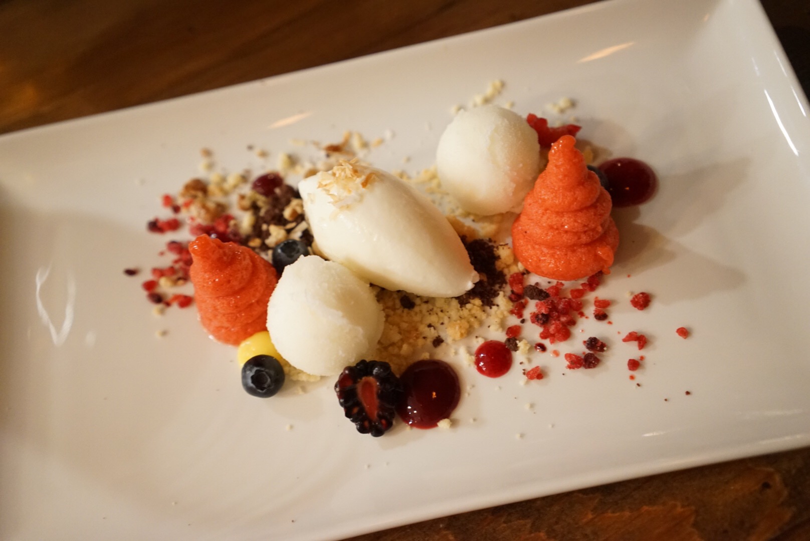 Lastly this little wonderland of dessert that I was too busy eating to even listen to the description… Something about two different kinds of sorbet, fresh whipped cream, freeze dried raspberry, fresh berries, berry sauce, yummy yummy something something… Sorry Chef! I promise I’ll return for another taste & actually pay attention this time!