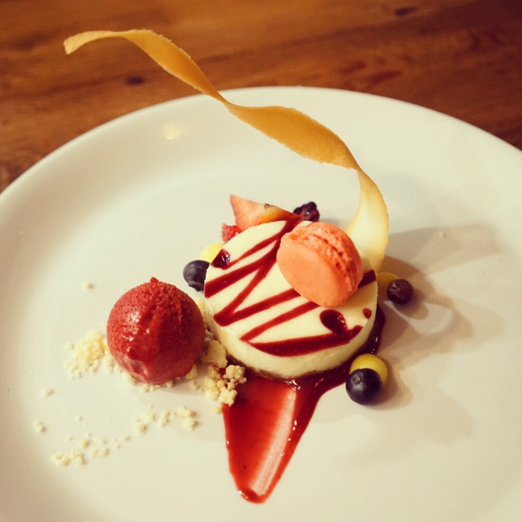 First was this beautifully presented cheesecake with berry sauce, raspberry sorbet, fresh berries, hazelnut powder & an adorable mini macaron.