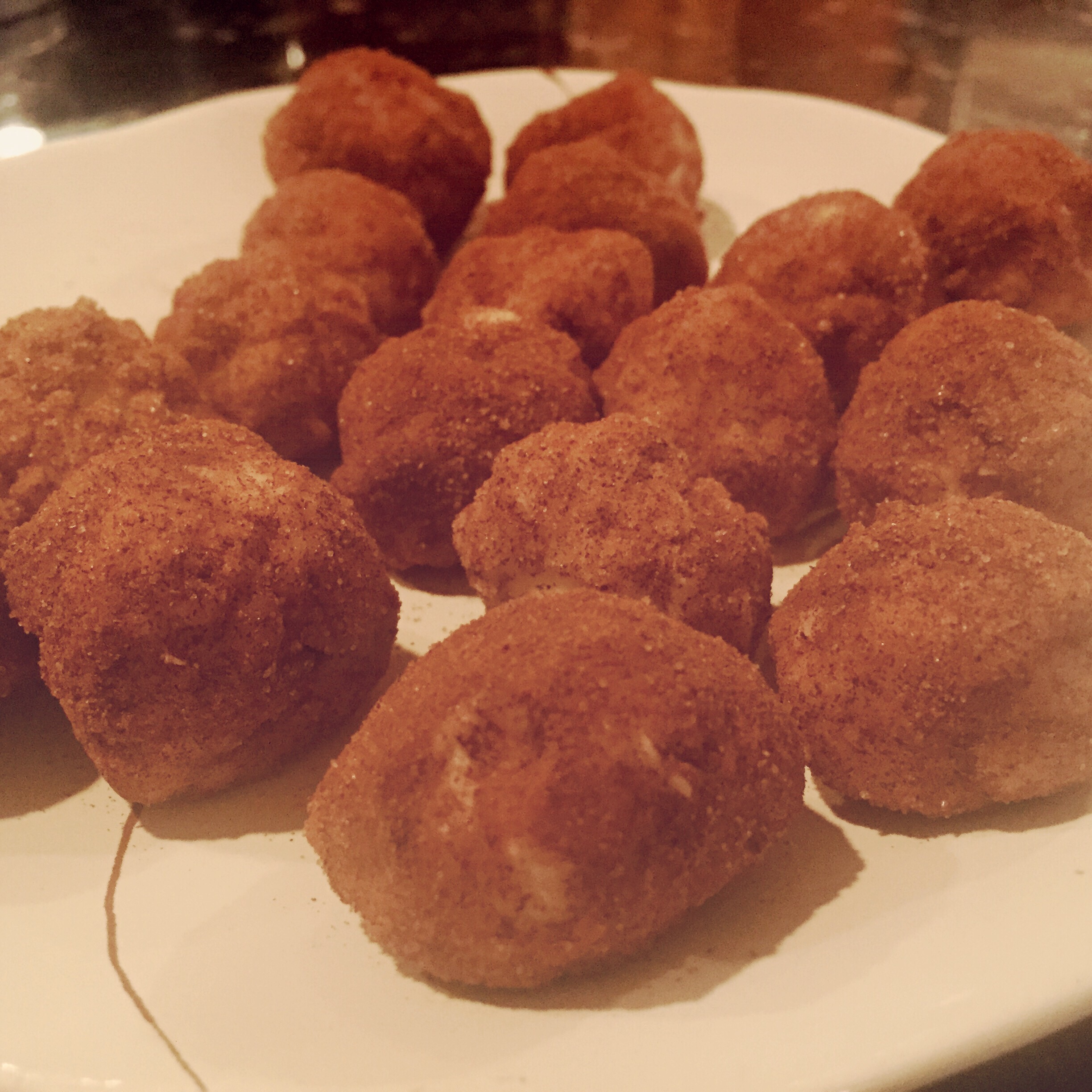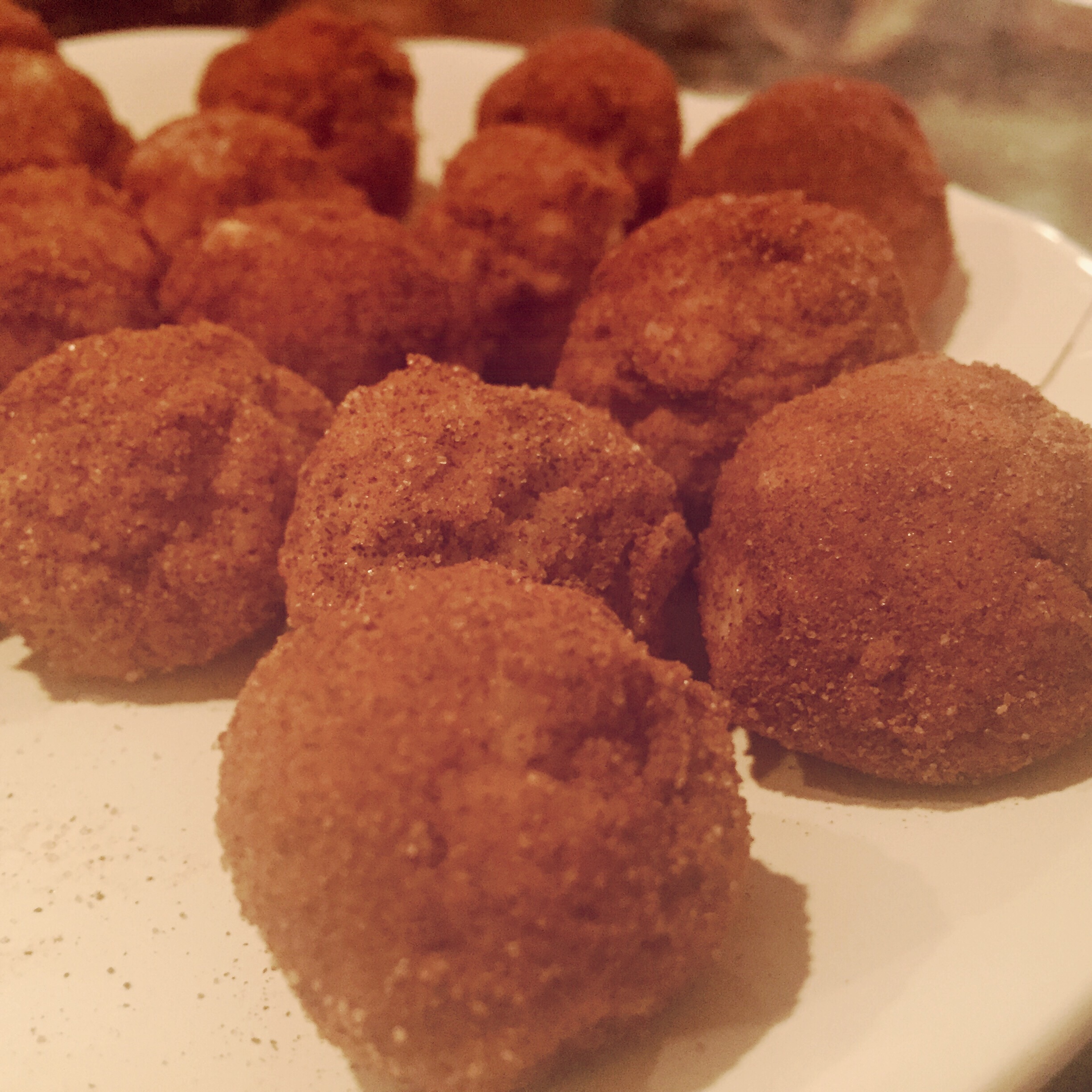 FInally, roll the dough into balls “potatoes” about the size of your thumb and finish them off by rolling in cinnamon sugar.