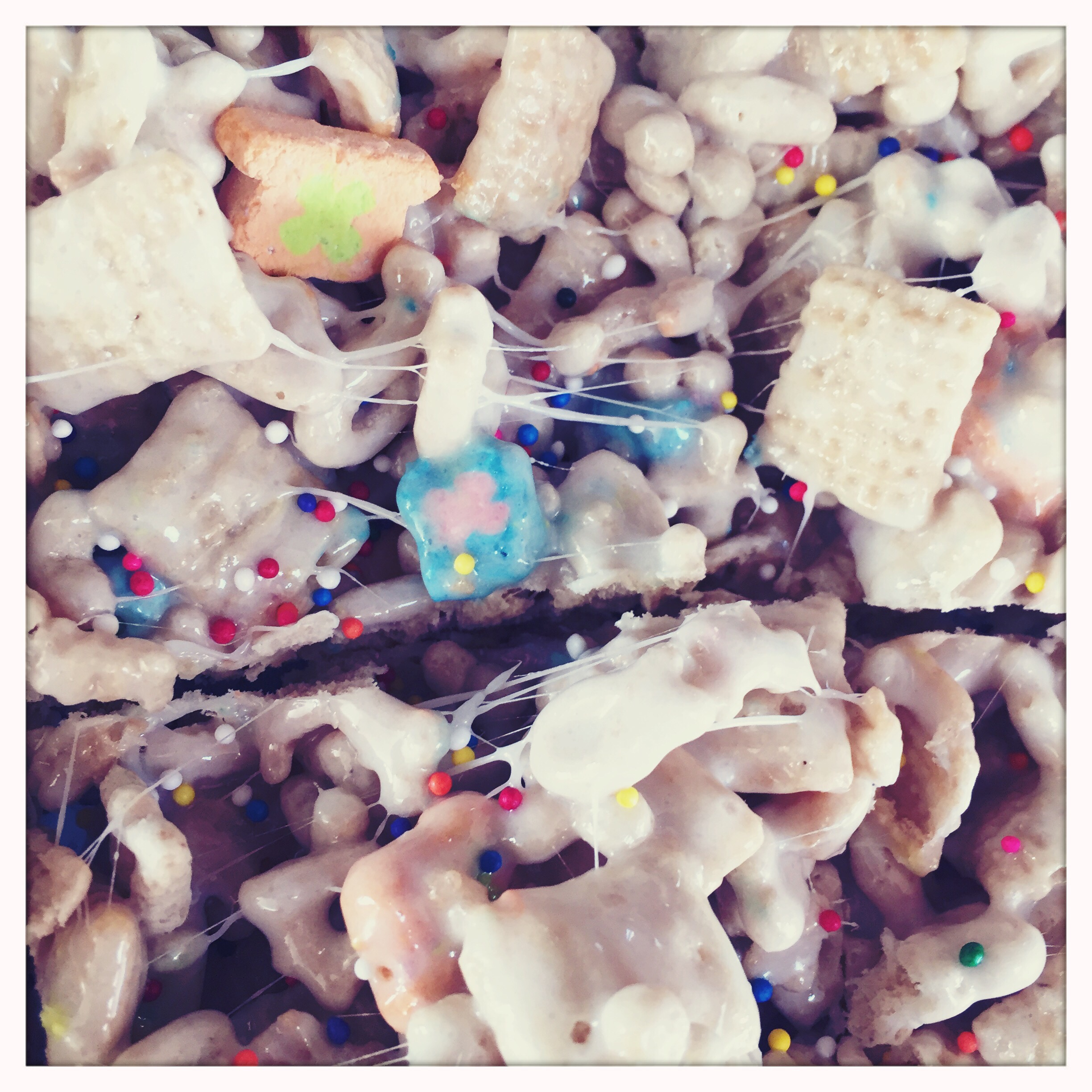 Add the cereal in cup by cup, stirring all the while until everything is well incorporated and nice and gooey.